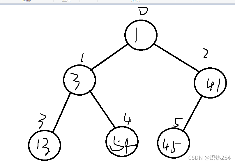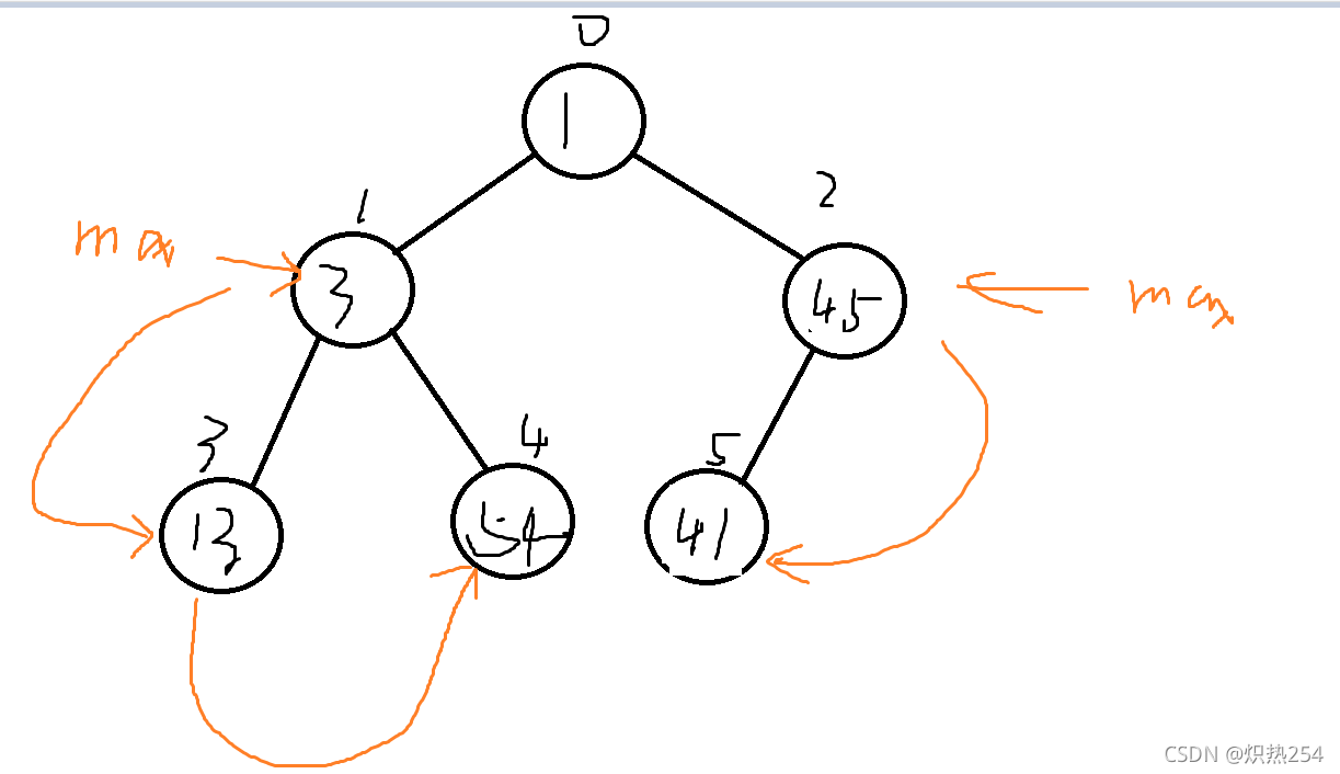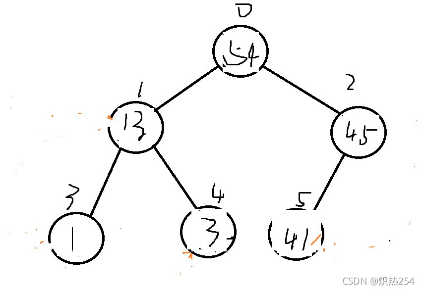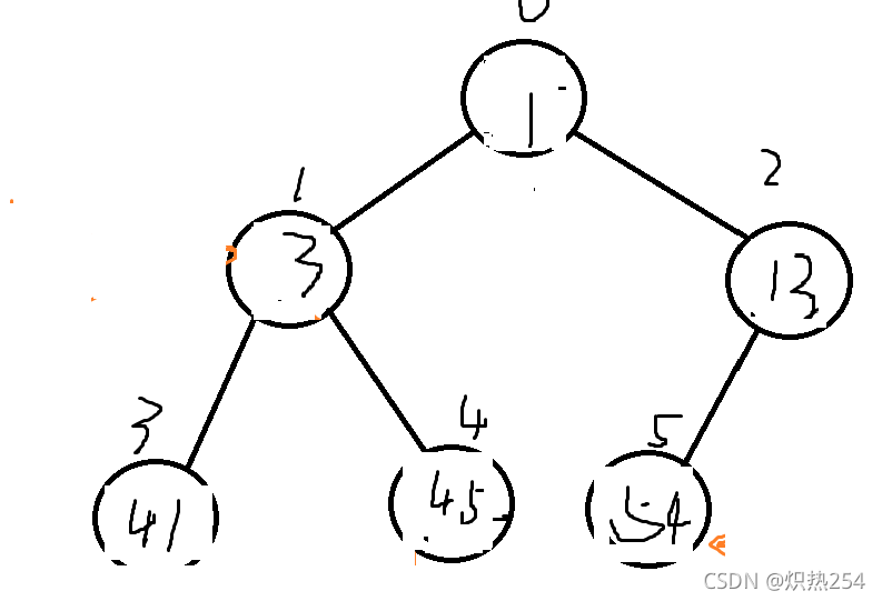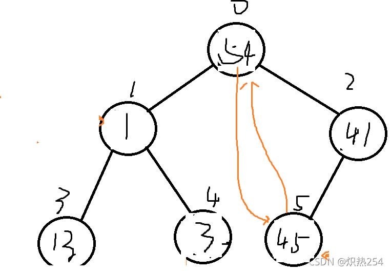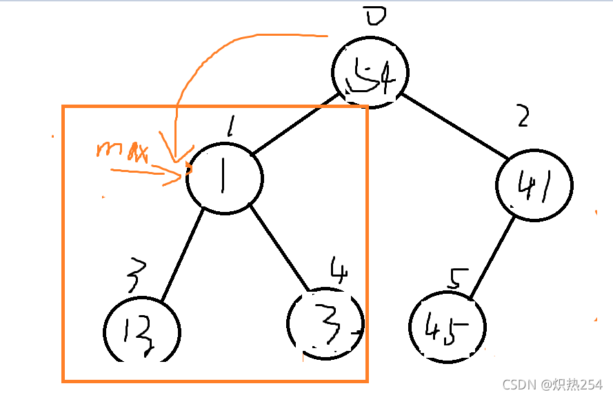 ;由于41<45,交换max,此时max=5,没有右孩子,结束对他的判断;对于1号结点(max=1):3<13,交换(max=3);之后在将最大值与右孩子比较,13<54;继续交换(max=4);
