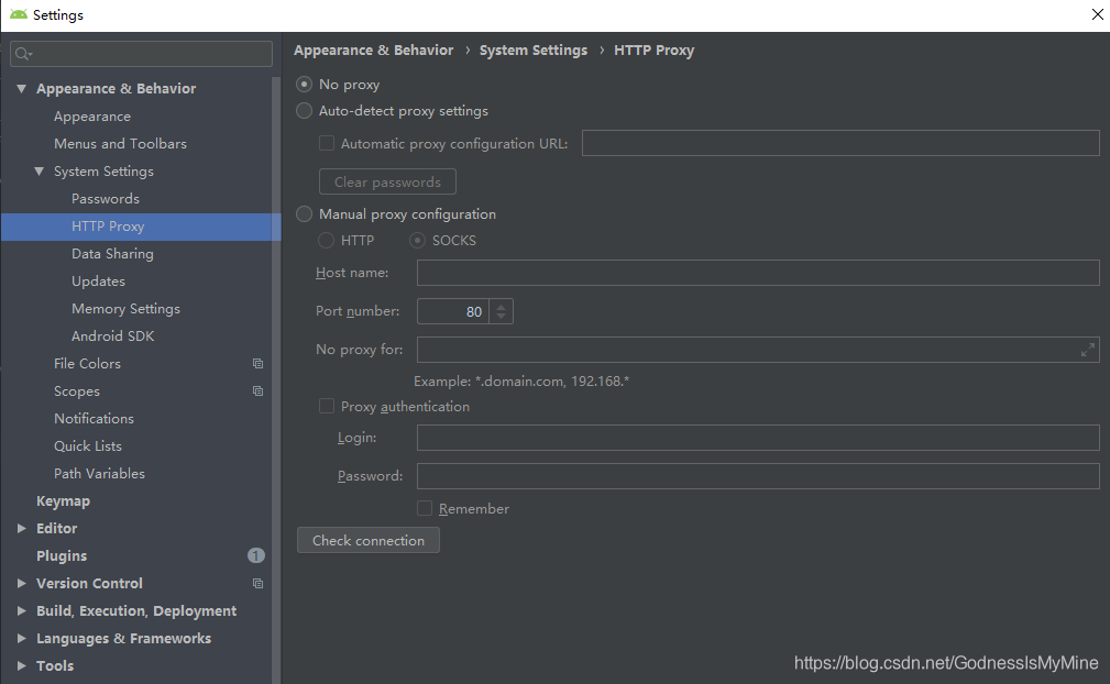 1.将Settings 下的Http Proxy 设置为 No Proxy 记得Apply