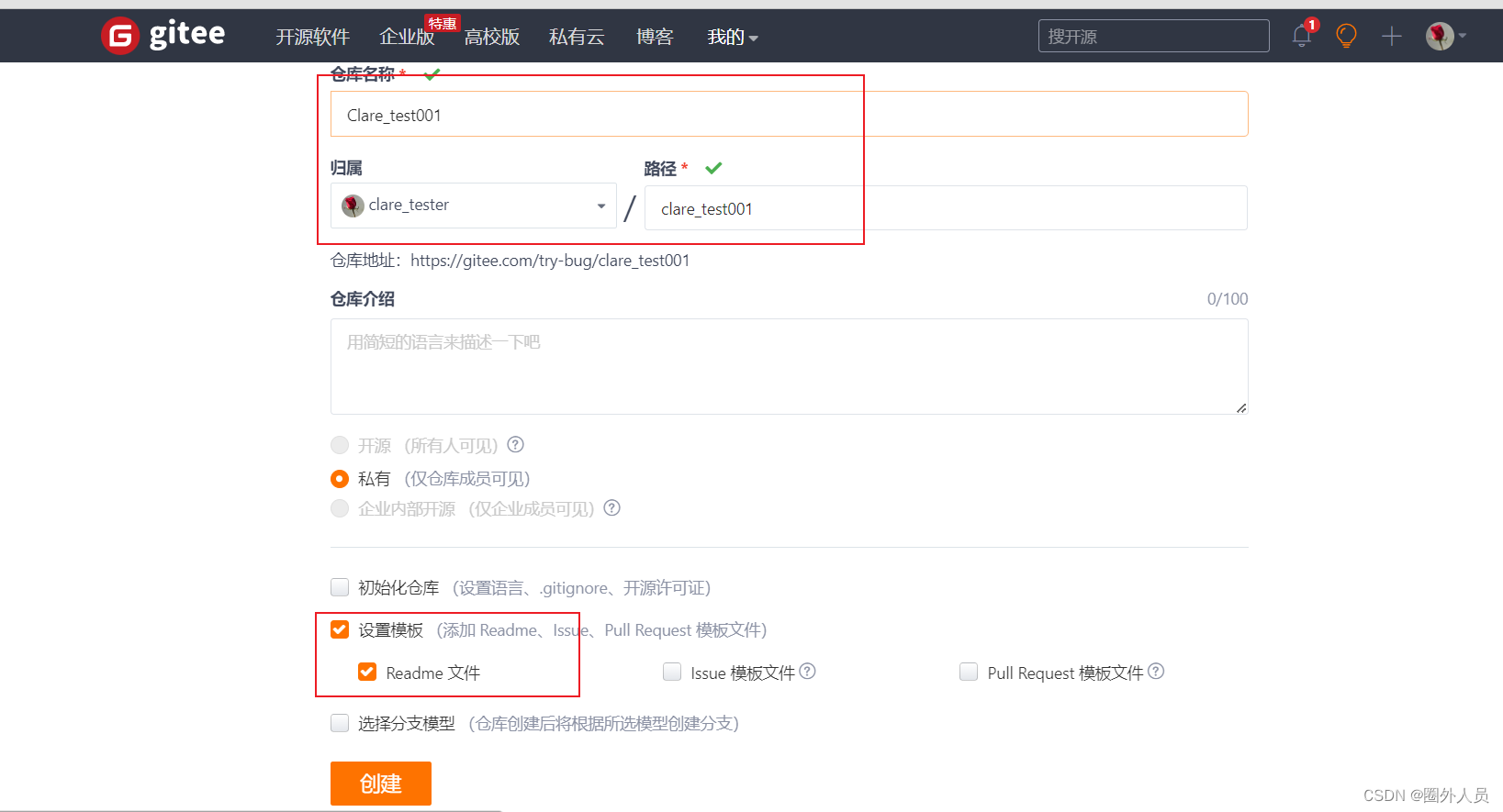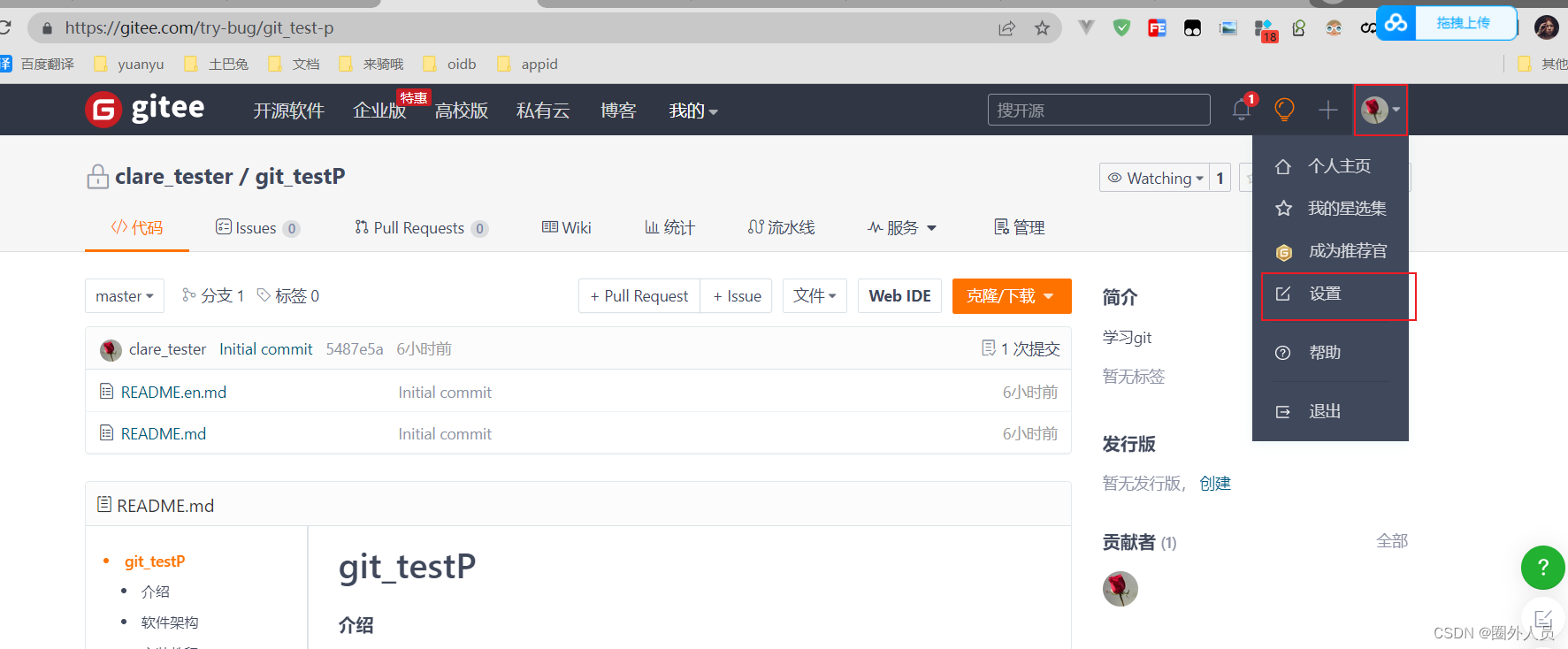 2、 获取仓库地址:git@gitee.com:try-bug/git_test-p.git