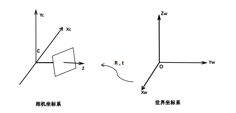 (1)首先,从世界坐标系转换为相机坐标系,这一步是三维点到三维点的转换,包括 R,t (旋转矩阵和平移矩阵)等参数;