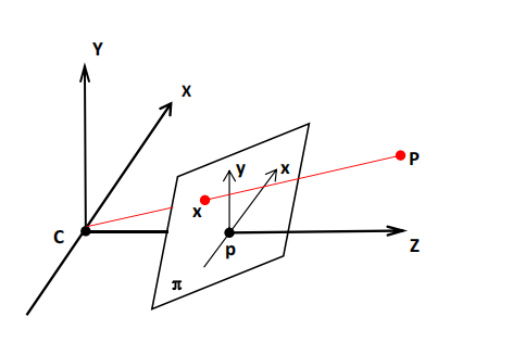 像平面上的 x 和 y 坐标轴是与相机坐标系上的 X 和 Y 坐标轴互相平行的; 相机坐标系是以 XYZ 三个轴组成的且原点在 C 点; 像平面坐标系是以 x ,y(小写)两个轴组成的且原点在 p 点