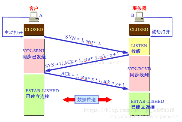 第一次握手:建立连接时,客户端发送syn包(seq=x)到服务器,并进入SYN_SENT状态,等待服务器确认;SYN:同步序列编号(Synchronize Sequence Numbers)。
