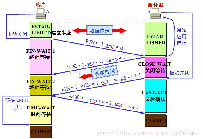 - 第四次挥手:客户端收到回复后,发送确认ACK=1,ack=w+1,自己的seq=u+1,客户端进入TIME-WAIT(时间等待)。客户端经过2个最长报文段寿命后,客户端CLOSE;服务器收到确认后,立刻进入CLOSE状态。