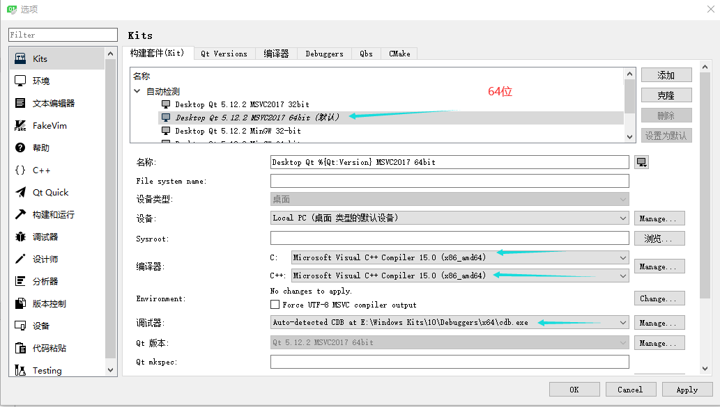 【2】选择mingw编辑器及MSVC编译器,source及后面的qt组件