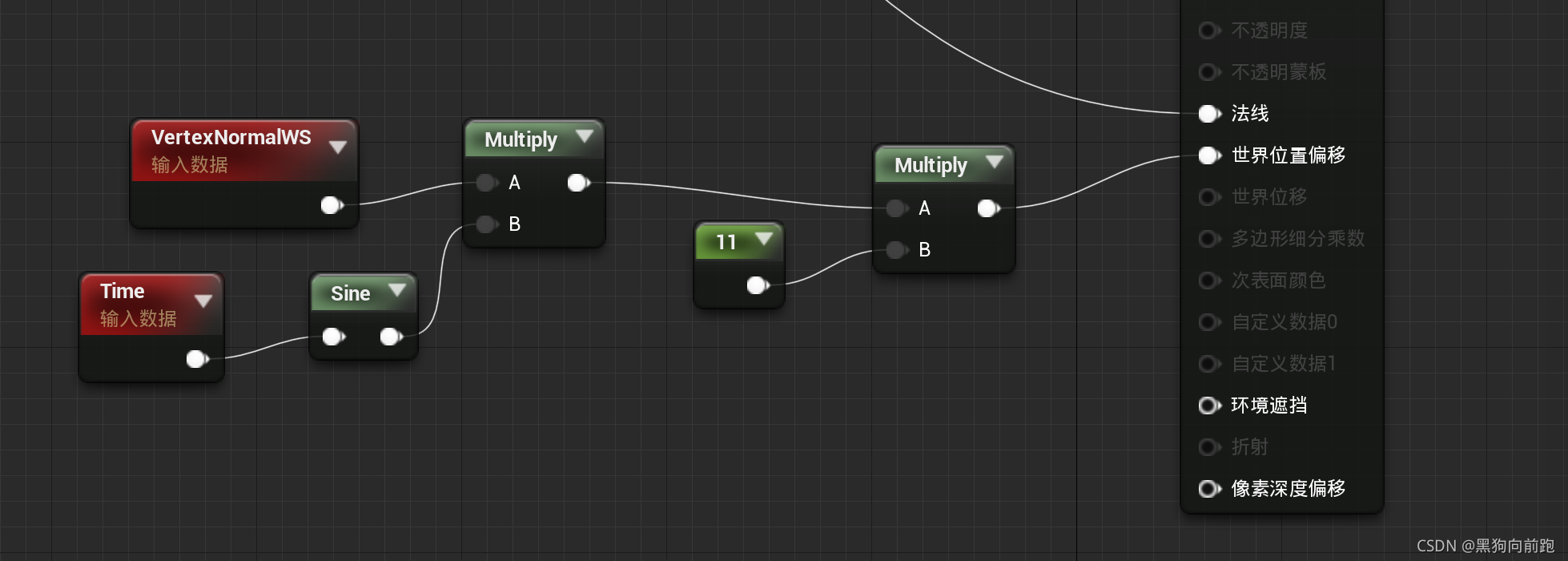 表达式输出世界场景空间顶点法线。它只能用于在顶点着色器中执行的材质输入,例如WorldPositionOffset。该表达式对于设置网格体增大或缩小很有用。请注意,沿法线偏移位置会导致几何图形沿UV缝隙拆分。