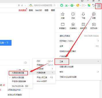 打开360安全浏览器,并点击【打开菜单-工具-代理服务器-代理服务器设置】