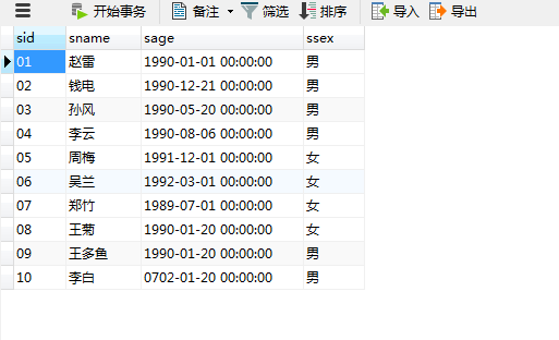 在分别介绍一下每个表的字段 学生表(Student )有四个字段 sid–学生id,sname–学生姓名,sage–学生年龄,ssex–学生性别