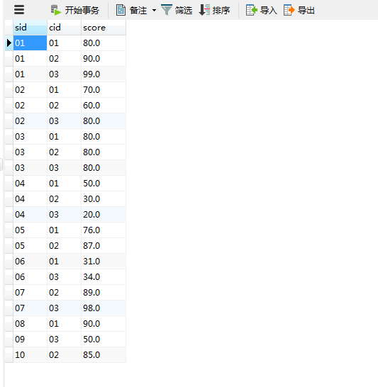 成绩表(SC)有三个字段,sid–学生id,cid–课程id,score–成绩