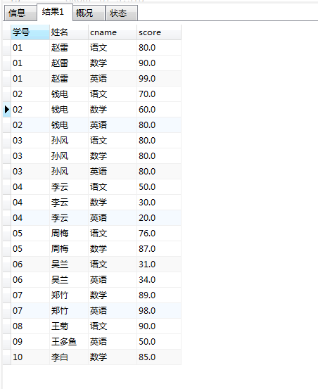 使用case when 对c.cname进行判断,使用max()函数和sum()函数均可实现行到列的转换。