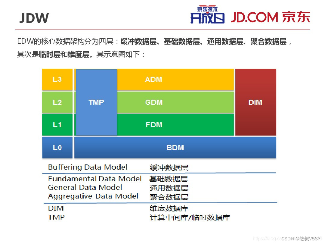 ods->cdm->ads这种划分,dwd、dim、dws其实是在cdm里面的,目测也不是那么一串下去的。再看看下图京东的划分。
