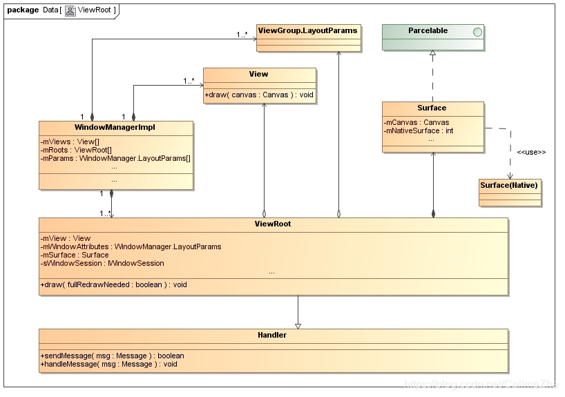 IWindowSession.Stub.Proxy类的成员函数relayout获得了从WindowManagerService服务返回来的一个绘图表面,即一个Java层的Surface对象之后,就会将它的内容拷贝到参数outSurface所描述的另外一个Java层的Surface对象中,这里通过调用Surface类的成员函数readFromParcel来实现的。注意,参数outSurface所描述的这个Java层的Surface对象是在应用程序进程这一侧创建的,它的作用是用来绘制应用程序窗品的UI。