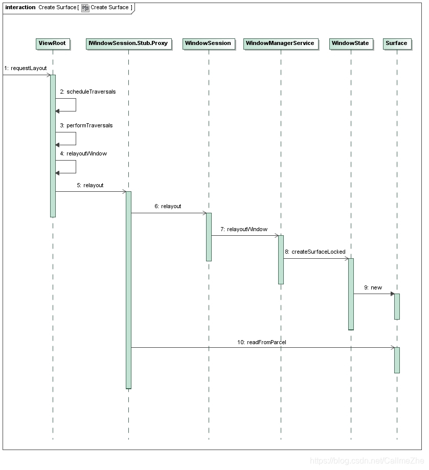 一文可以知道,当一个应用程序窗口被激活并且它的视图对象创建完成之后,应用程序进程就会调用与其所关联的一个ViewRoot对象的成员函数requestLayout来请求对其UI进行布局以及显示。由于这时候应用程序窗口的绘图表面尚未创建,因此,ViewRoot类的成员函数requestLayout就会请求WindowManagerService服务来创建绘图表面。接下来,我们就从ViewRoot类的成员函数requestLayout开始,分析应用程序窗口的绘图表面的创建过程,如图4所示: