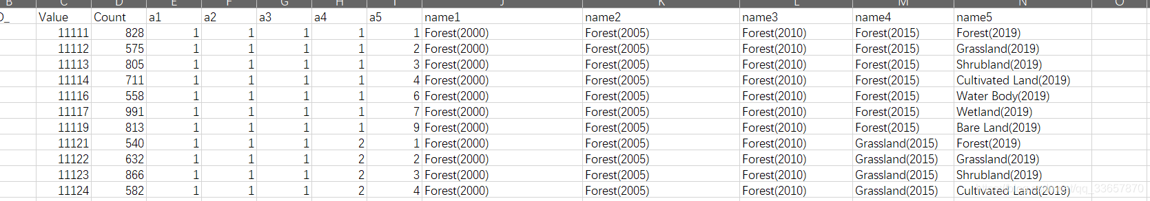 得到栅格数据即为转移情况,将栅格数据的属性表导出到本地,如下,其中,11113表示2000,2005,2010,2015是1,2019是3。