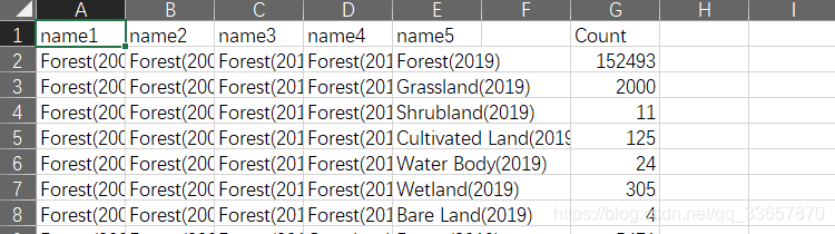 笔者在后面添加十个表头,如下。将Value值拆分,分别赋值给a1-a5,name1-name5用于存储五期数据土地利用名字,如Forest(2000),Forest(2005)等