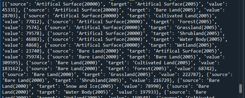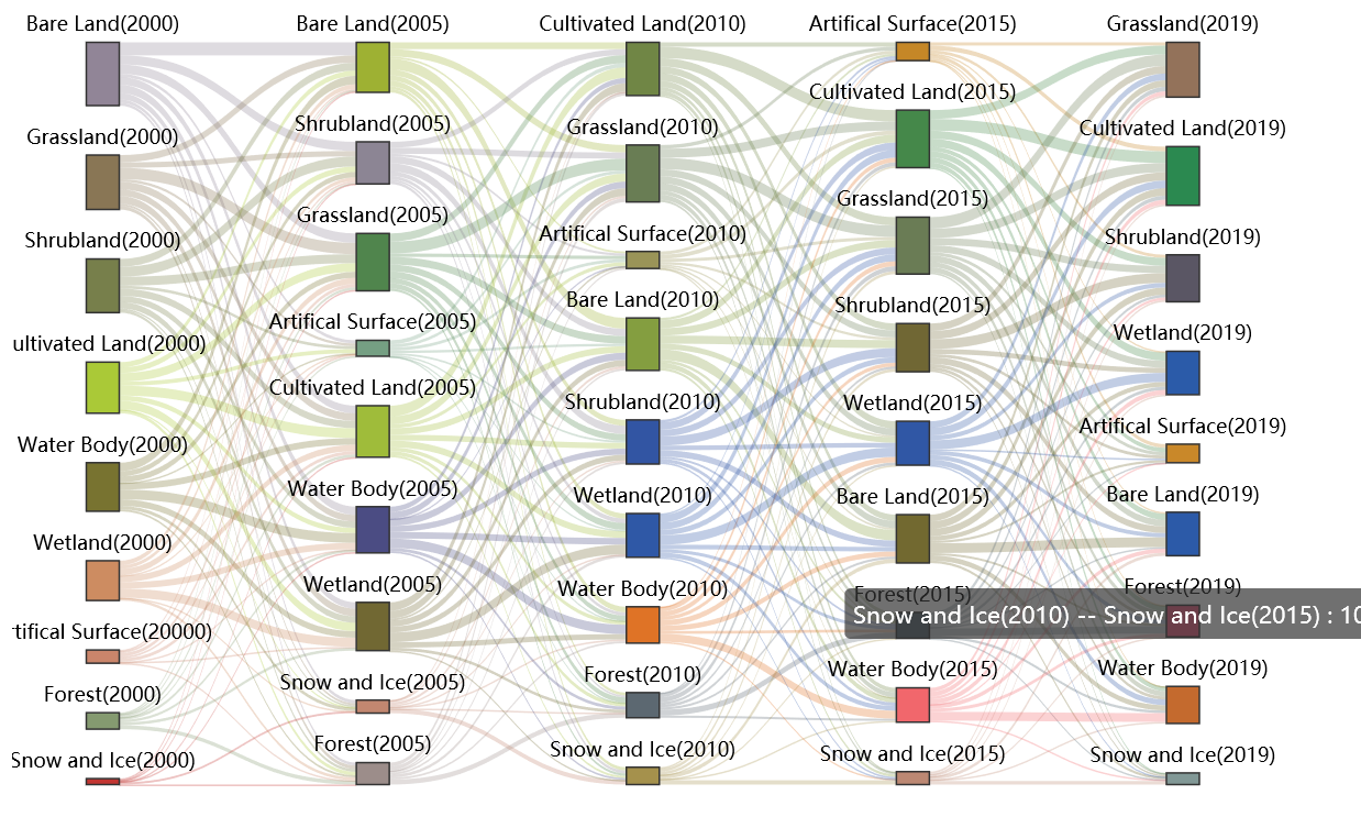 对于土地利用文献中大多使用转移矩阵的方式。本博客实现2000年,2005年,2010年,2015年,2019年土地利用之间的转移情况使用桑基图可视化。