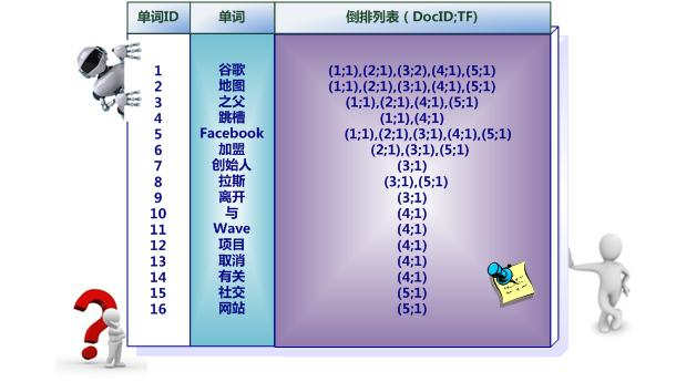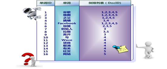 中文和英文等语言不同,单词之间没有明确分隔符号,所以首先要用分词系统将文档自动切分成单词序列。这样每个文档就转换为由单词序列构成的数据流,为了系统后续处理方便,需要对每个不同的单词赋予唯一的单词编号,同时记录下哪些文档包含这个单词,在如此处理结束后,我们可以得到最简单的倒排索引。在下图中,“单词ID”一栏记录了每个单词的单词编号,第二栏是对应的单词,第三栏即每个单词对应的倒排列表。比如单词“谷歌”,其单词编号为1,倒排列表为{1,2,3,4,5},说明文档集合中每个文档都包含了这个单词。