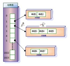 主体部分是哈希表,每个哈希表项保存一个指针,指针指向冲突链表,在冲突链表里,相同哈希值的单词形成链表结构。之所以会有冲突链表,是因为两个不同单词获得相同的哈希值,如果是这样,在哈希方法里被称做是一次冲突,可以将相同哈希值的单词存储在链表里,以供后续查找。