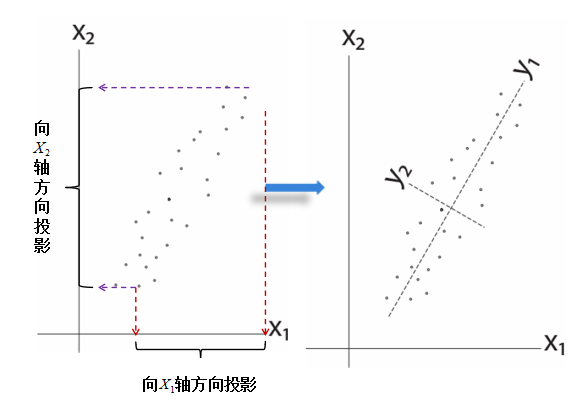 这些数据服从高斯分布,落在二维的坐标轴上,这些数据就形成了一个椭圆形状的点阵。椭圆有一个长轴和一个短轴,在短轴方向上,我们可以看到数据变化较少;如果在极端的情况下,短轴就退化成一点,那么只有在长轴的方向才能够解释这些点的变化了。于是,样本数据就从二维降维到一维了。根据最大方差理论,也就是