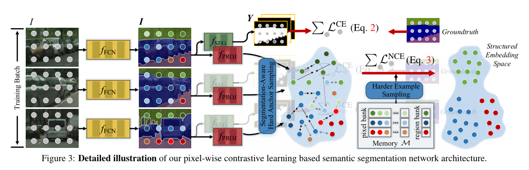 如下图,对不同图片中的同类像素,通过对比学习的方法使同类像素的embedding靠近,不同类别像素的embedding远离,来提升语义分割的效果。