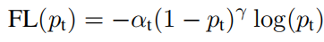 何凯明大神的RetinaNet中提出了Focal Loss来解决类别不平衡的问题,下式为focal loss的公式,α为类别的权重,γ为大于0的值,在2分类的情况下: