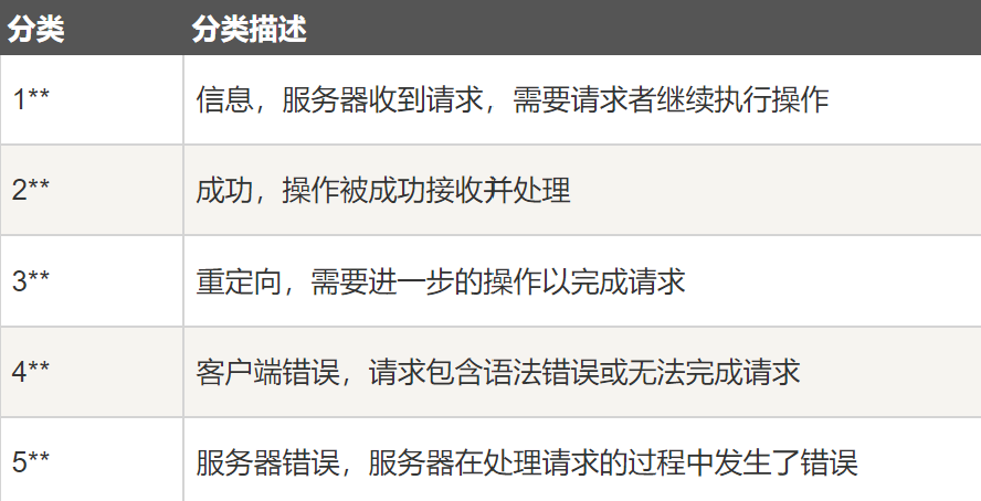 :信息响应(100–199),成功响应(200–299),重定向(300–399),客户端错误(400–499)和服务器错误 (500–599)。