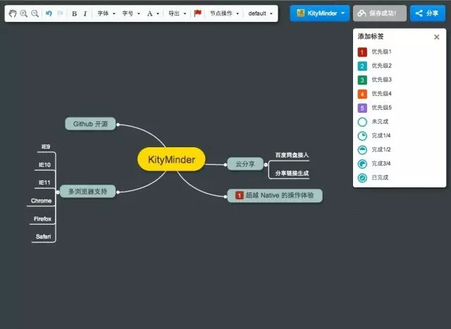 KityMinder 是百度FEX团队的f-cube小组(原UEditor小组)的又一力作。作为一款在线的脑图编辑工具,它有着很多Native编辑工具的交互体验。KM与UE有着一样的宗旨,就是注重最终用户的使用体验。同时,它充分发挥了Web云存储的优势,可以直接将编辑中的脑图同步到云端。此外,借由独创的 “云盘分享”功能,用户可以一键将当前编辑的脑图直接生成在线链接共享给其他用户,实现无缝沟通。