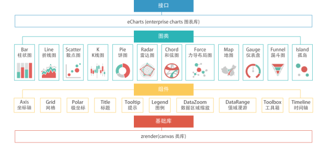 (一个全新的轻量级canvas类库),创建了坐标系,图例,提示,工具箱等基础组件,并在此上构建出折线图(区域图)、柱状图(条状图)、散点图(气泡图)、饼图(环形图)、K线图、地图、力导向布局图以及和弦图,同时支持任意维度的堆积和多图表混合展现。