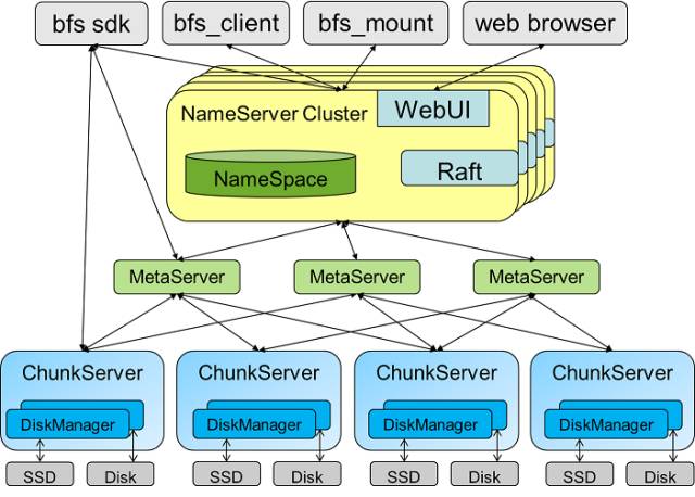 系统主要由NameServer、MetaServer、ChunkServer、SDK、bfs_mount和bfs_client等几个模块构成。