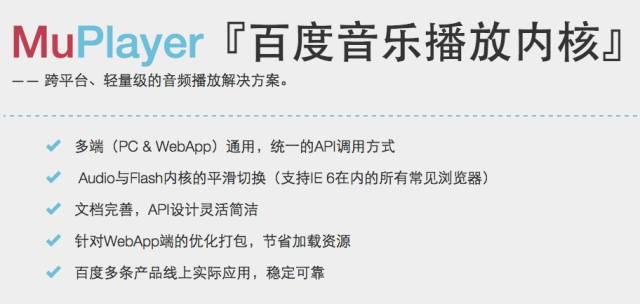 团队开发维护的浏览端音频播放内核,它基于HTML5 Audio及Flash音频技术,已在百度音乐多个线上产品线中应用,具备很强的灵活性和稳定性。