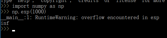 # 指数函数的运算容易出现很大的超出数值范围(4或8字节)的数字,如exp(1000)导致溢出overflow