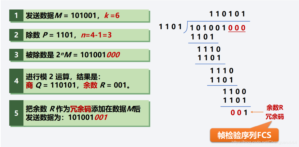 • CRC 是一种常用的检错方法,而 FCS 是添加在数据后面的冗余码。