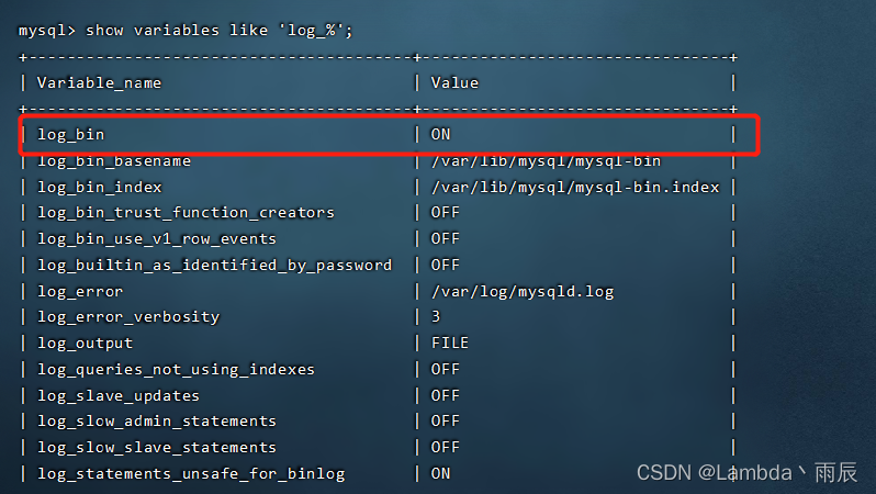 5、再次使用命令show variables like ‘log_%’;进行查看,为ON表明binlog开启