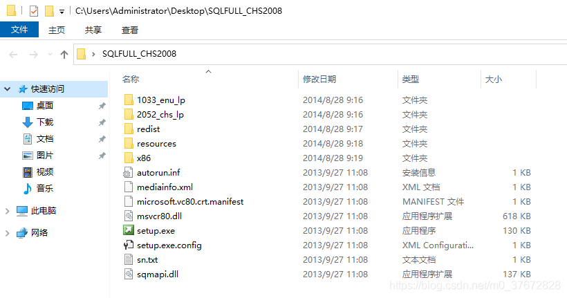 首先在网络上下载到 SQLFULL_CHS2008 的安装包,然后进行解压,获得以上文件以后双击“setup.exe”