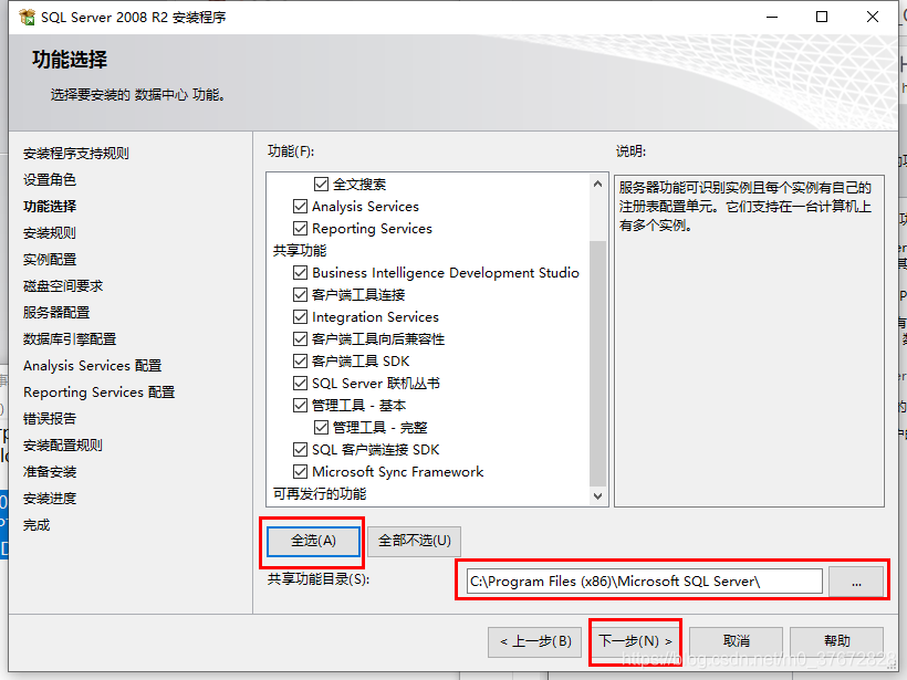 功能可以全部选中,安装位置建议默认(只是数据库安装的载体安装目录而已,后期网站运行可以将制定的库保存的文件位置放到指定的位置),然后点击下一步