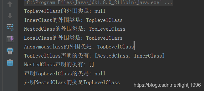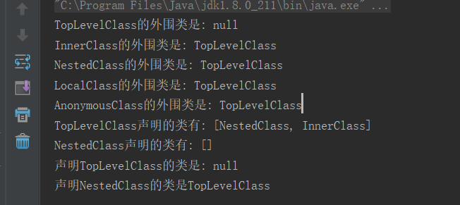 System.out.println("声明TopLevelClass的类是: " + (TopLevelClass.class.getDeclaringClass() == null ? null : TopLevelClass.class.getDeclaringClass().getSimpleName()));