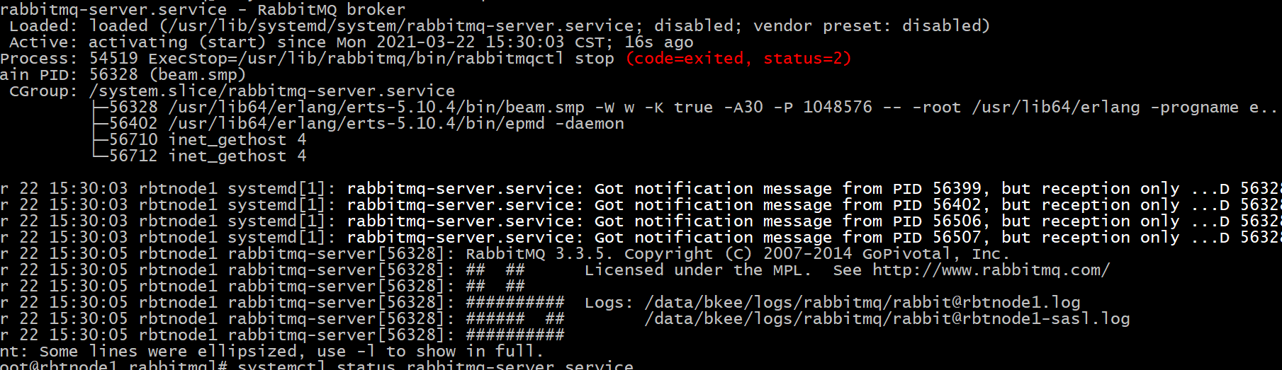 2)先去从节点启动rabbitmq,之后启动主节点,服务即正常【服务正常后可以再按照原来主-从的顺序重新停启一遍】。
