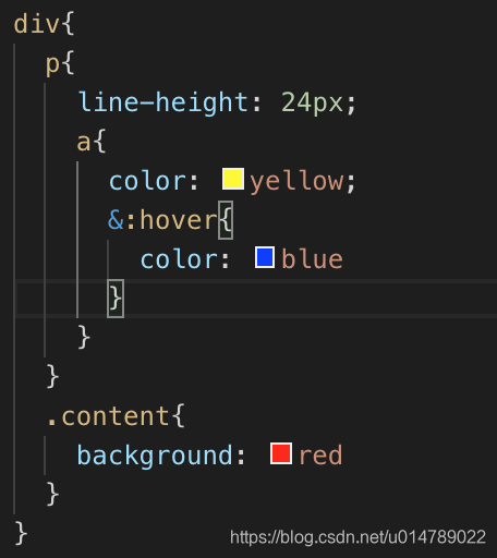 sass中的嵌套规则可以减少很多代码的书写,形式是在外层选择器中,嵌入其后代的选择器,例如:在CSS中的div p {},在sass的形式是div{ p {} },最终sass编译出的css是div p {},在复杂的多层样式下,显然用sass会方便很多,举例: