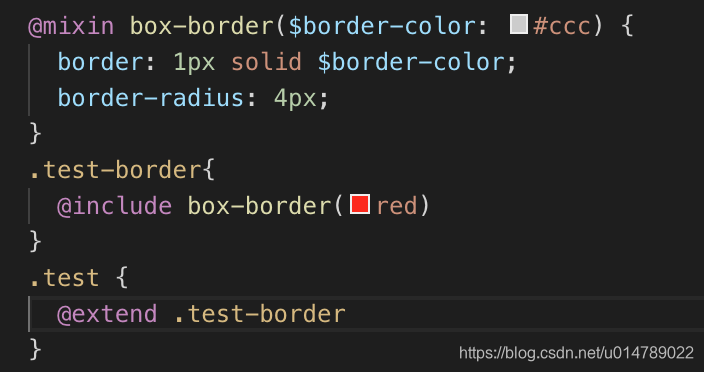 上面是一个简单例子,只为说明继承的作用,在.test中继承了.test-border,最终会拷贝.test-border的样式到.test中。