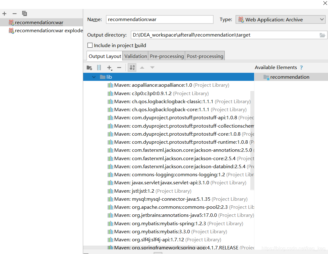 在File->project structure中察看自己的target输出目录,并且点击右侧项目察看web-inf下的lib文件是否包含所有需要的jar包: