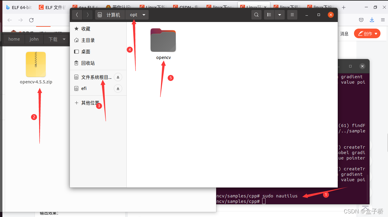 下载好之后我是通过终端以下指令打开root的文件管理器,将下载好的zip文件解压到了/opt里面然后更名为opencv.(作为小白,暂时只知道这样子好操作)