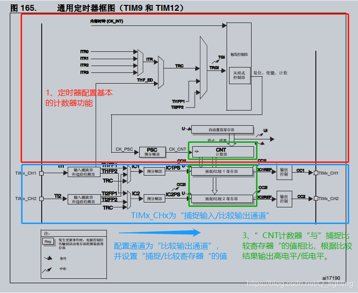 通过图中可以看出,图中上半部分是基本计数器的功能(通用定时器与基本定时器的计数器功能差别在于多了几种时钟输入的方式),图中下半部分是通过定时器的”捕获输入/比较输出通道“(TIMx_CH1或TIMx_CH2),通过把”捕获输入/比较输出通道“配置为”比较输入“通道后,”CNT计数器“与”捕捉/比较寄存器“对比之后,TIMx_CH1或者TIMx_CH2通道就会输出高电平或者低电平。