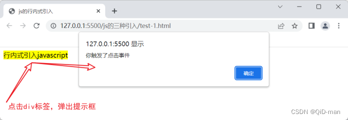 <div onclick="alert('你触发了点击事件')">行内式引入javascript</div>