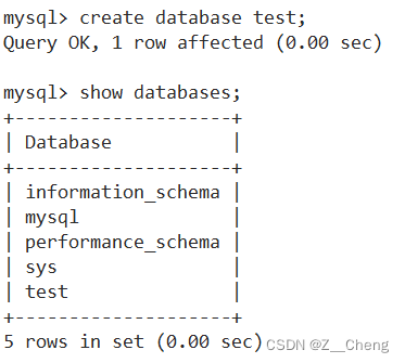 在主服务器上执行create database test;
