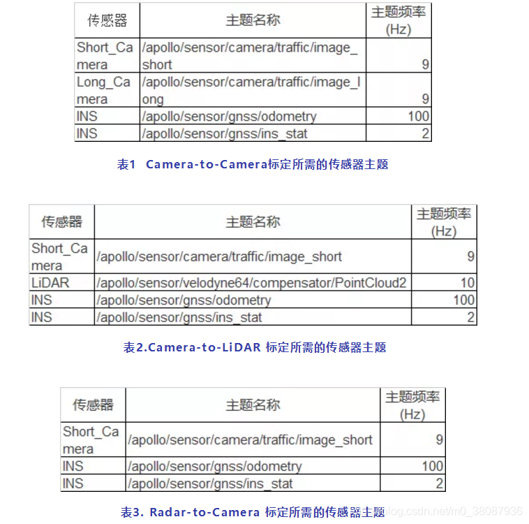 表1、表2和表3分别列出了不同标定板载程序所需的传感器主题。