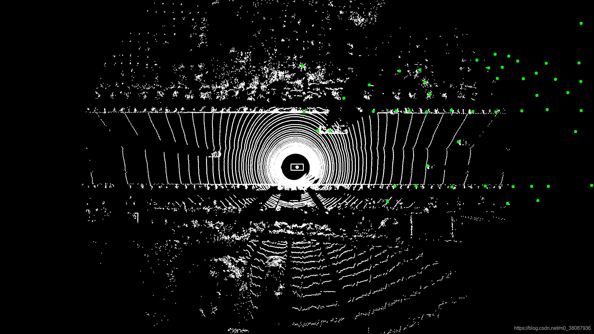 在融合图中,所有白色的小点代表LiDAR点云,而大的绿色实心圆表示雷达目标。