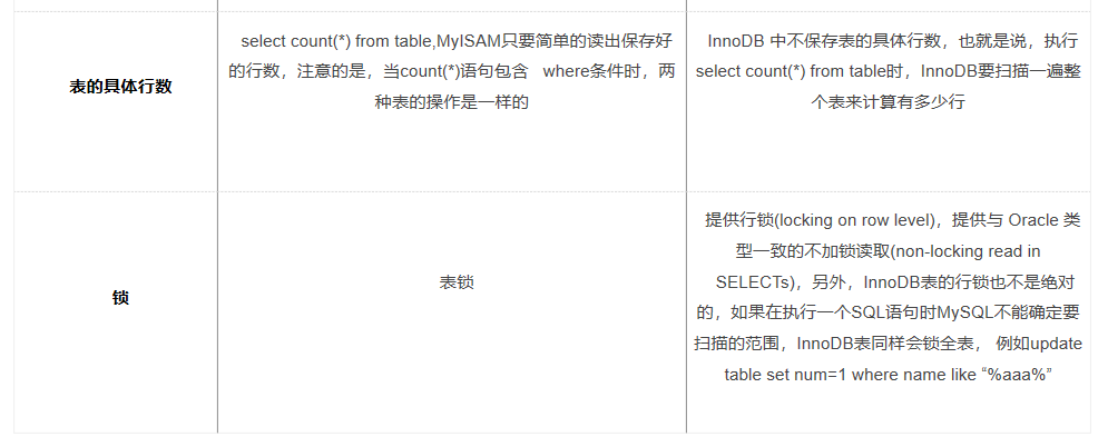 InnoDB支持事务,支持行锁和表锁用的比较多,Myisam不支持事务,只支持表锁。