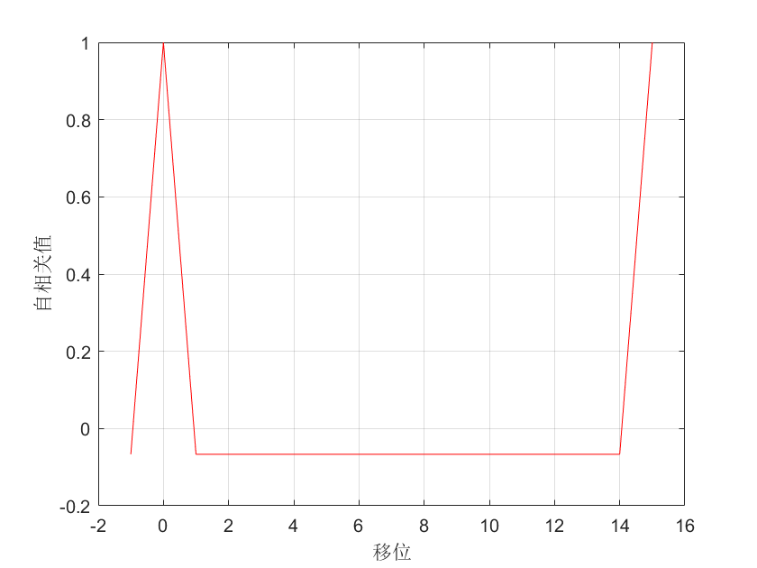将0-1序列变换为双极型序列,其中1→-1,0→1。在求其自相关值。示例代码如下: