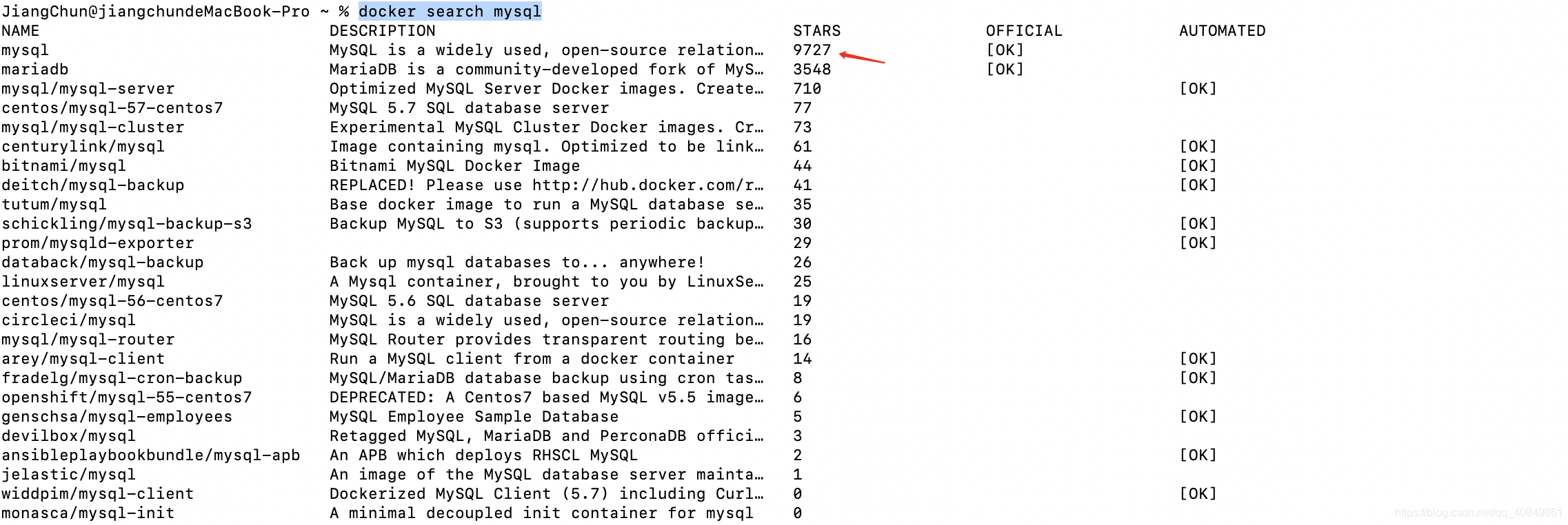 docker search mysql 查看MySQL镜像 最好是选start 最多的