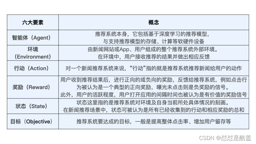 为了把强化学习技术落地,只清楚它的基本原理显然是不够的,我们需要清晰地定义出强化学习中的每个关键变量,形成一套通用的技术框架。对于一个通用的强化学习框架来说,有这么六个元素是必须要有的: