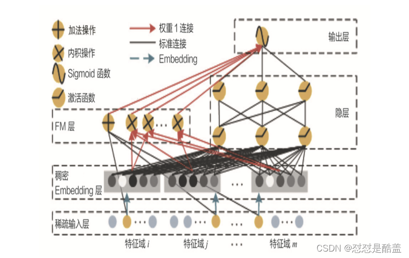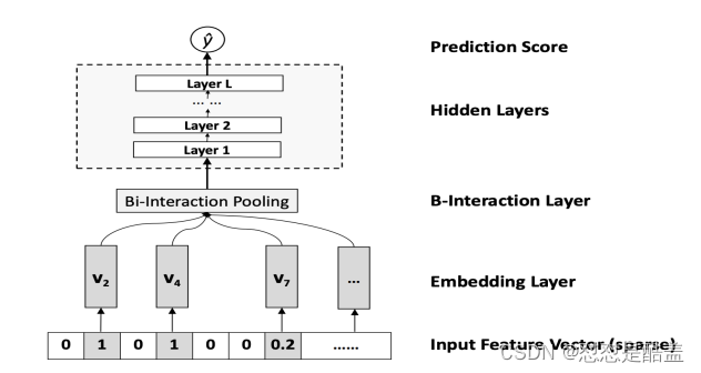 ② 特点:1)NFM 并没有使用内积操作来进行特征 Embedding 向量的交叉,而是使用元素积的操作。2)在得到交叉特征向量之后,也没有使用 concatenate 操作把它们连接起来,而是采用了求和的池化操作,把它们叠加起来。